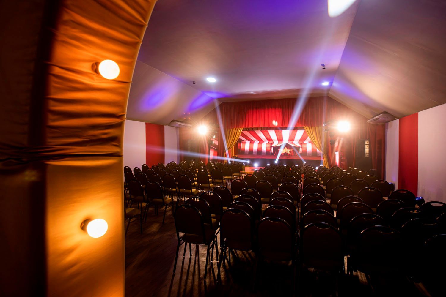 Nosso auditório Costa do Marfim oferece uma experiência imersiva, com um ambiente confortável e tecnológico. Seja para apresentações, exibições de filmes ou palestras, o espaço combina conforto e modernidade com aquele toque de decoração de teatro que faz toda a diferença, garantindo que seu público aproveite ao máximo cada momento. Um verdadeiro cinema dentro do resort.